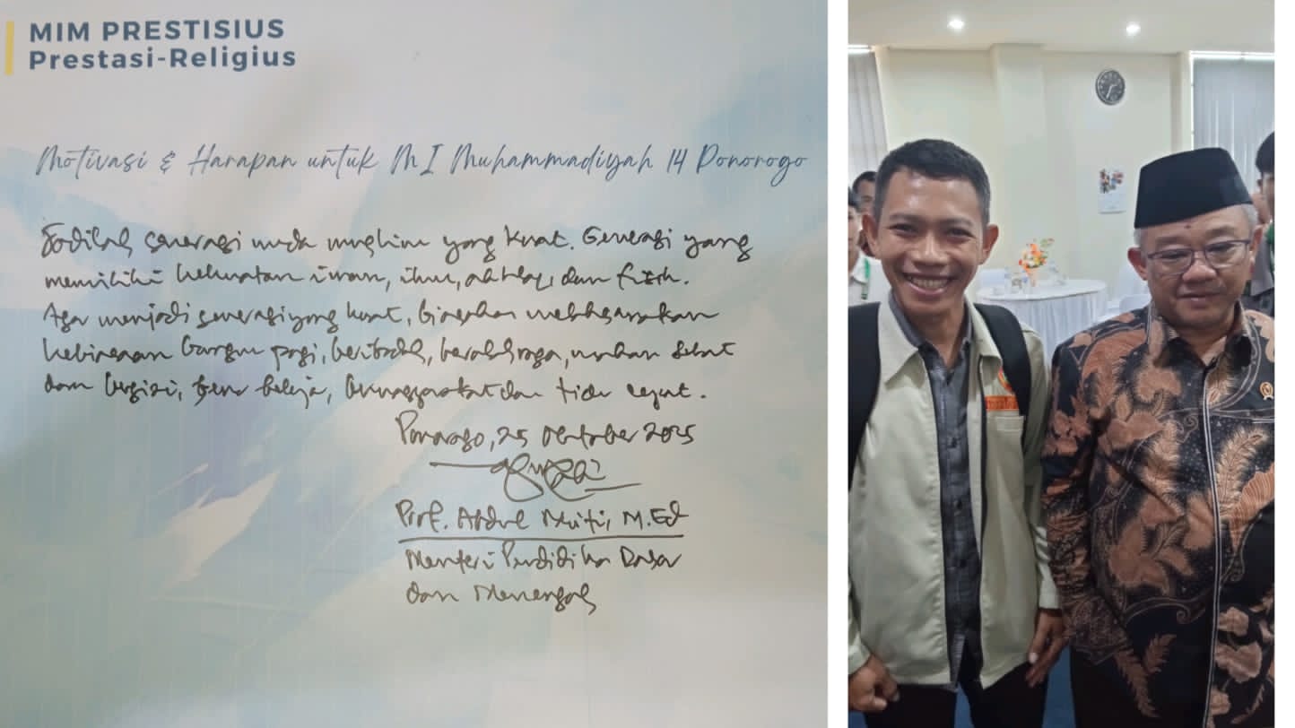 Ada momen menarik saat Kepala MI Muhammadiyah 14 (MIM 14) Prestisius Ponorogo, Miftahul Rahman, bertemu dengan Menteri Pendidikan Dasar dan Menengah (Mendikdasmen) RI, Prof. Dr. Abdul Mu’ti, M.Ed., di Universitas Muhammadiyah Ponorogo (Umpo) dalam acara Wisuda Sarjana dan Pascasarjana, Sabtu (25/10/25).