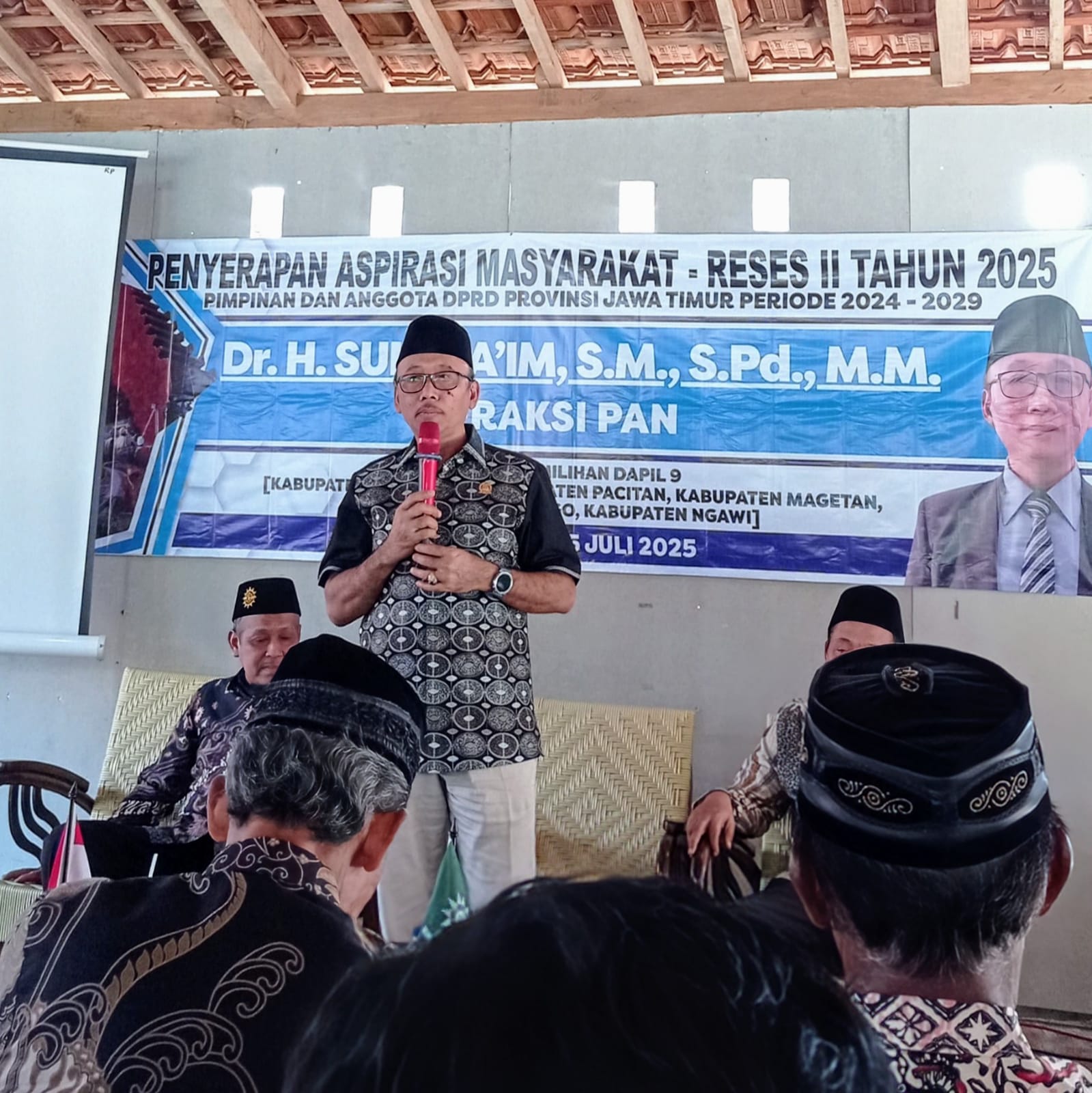 Anggota DPRD Provinsi Jawa Timur dari Fraksi Partai Amanat Nasional (PAN), Dr H Suli Da’im melaksanakan kegiatan Reses II Tahun 2025 di Rumah Peradaban, Desa Siwalan, Kecamatan Mlarak, Kabupaten Ponorogo, Selasa (1/7/26) pukul 10.00 WIB.